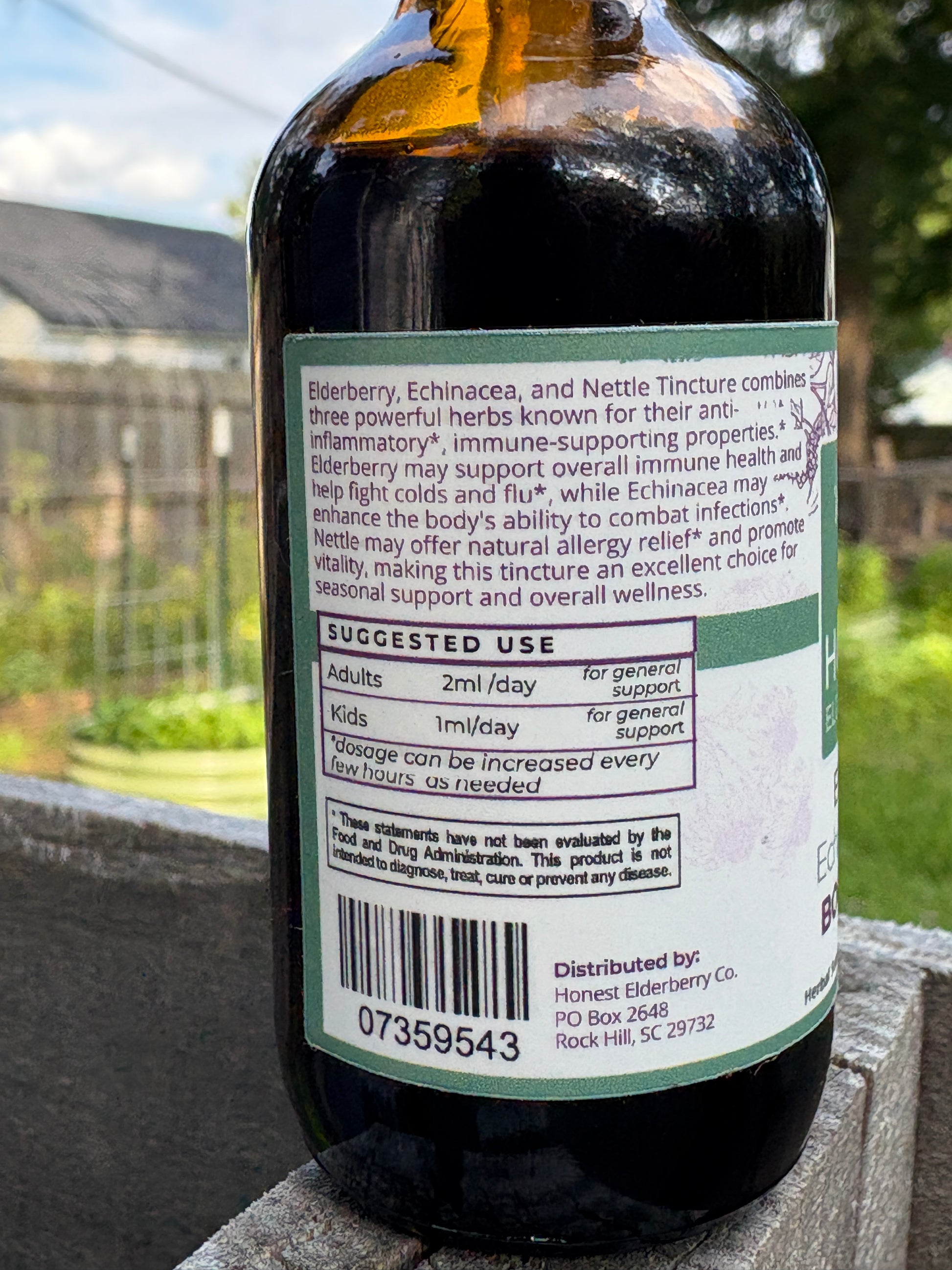 Elderberry, Echinacea, and Nettle Tincture combines three powerful herbs known for their immune-supporting properties (amongst many other benefits). Elderberry may support overall immune health and help fight colds and flu, while Echinacea may enhance the body's ability to combat infections. Nettle may offer natural allergy relief and promote vitality, making this tincture an excellent choice for seasonal support and overall wellness.