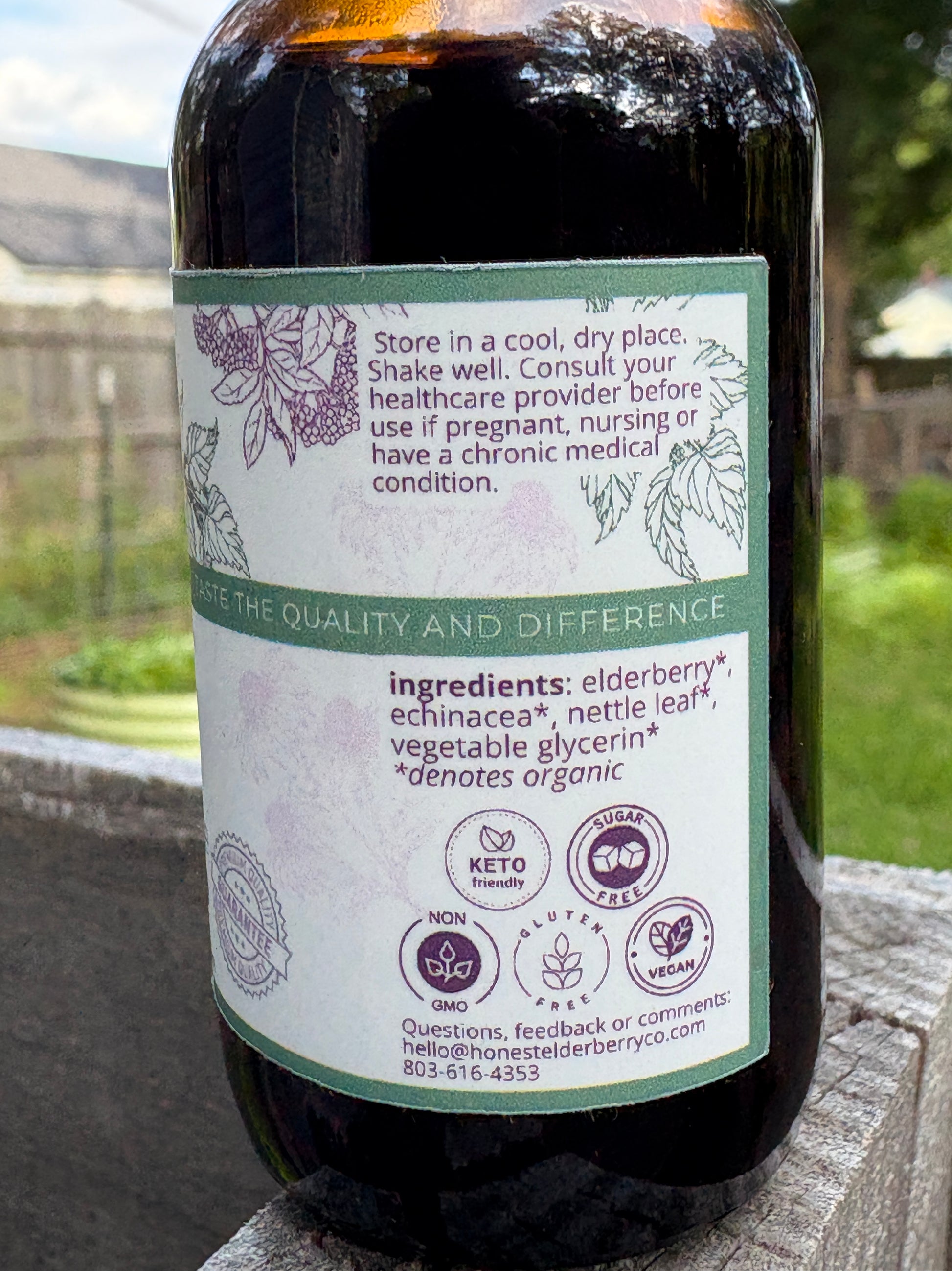 ingredients: organic elderberry, organic echinacea, organic nettle and organic vegetable glycerin.
